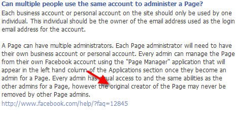 Note that wording--"the original creator of the Page may never be removed." Never is a long time, especially in a day and age when people no longer stay with one employer till death do they part.